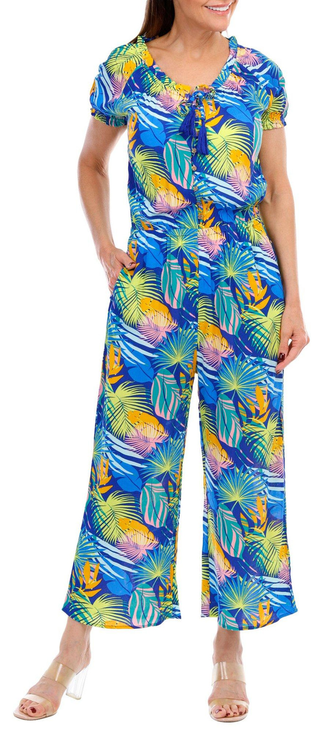 Step into summer with this Tropical Print Jumpsuit. Featuring a round neckline, short sleeves, and a tie-front detail, this jumpsuit offers a relaxed yet stylish fit. The button placket adds a touch of charm, making it perfect for warm-weather days and casual outings.