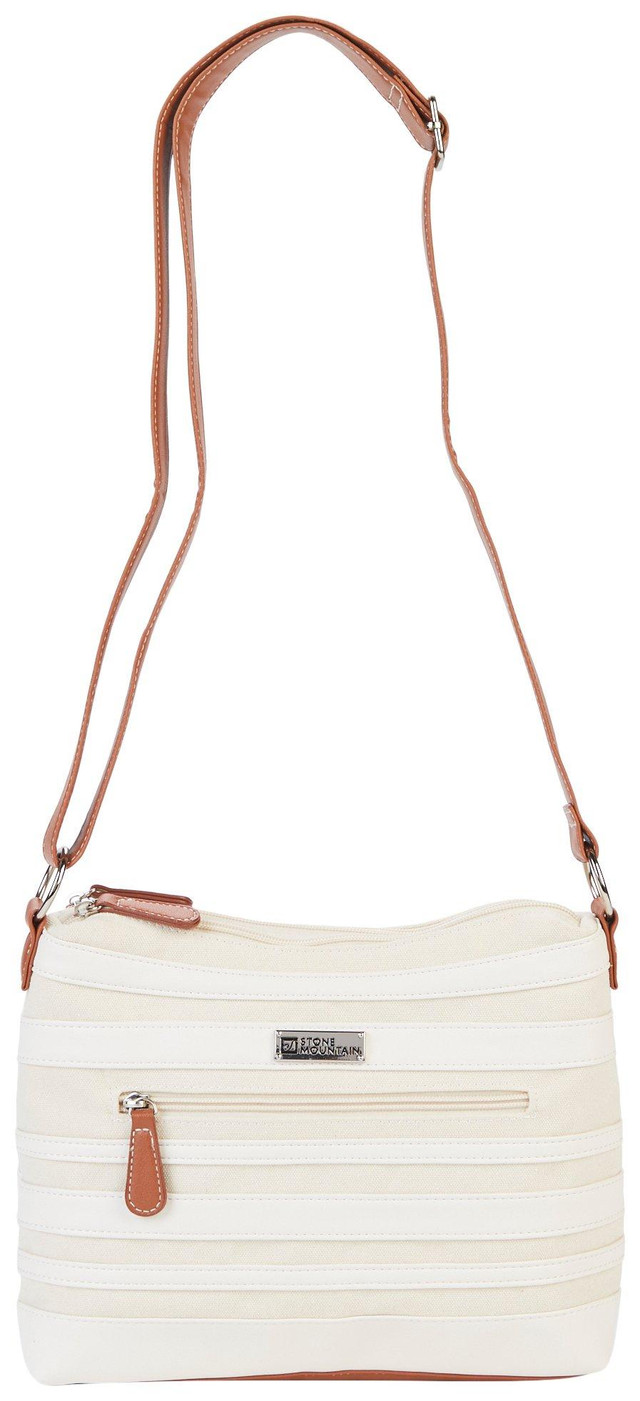 Nantucket Crossbody by Stone Mountain Designed in white canvas with tan faux leather trim, this compact crossbody offers smart style and everyday organization. Features five zip pockets: two exterior, one interior, and two spacious main compartments. Adjustable strap and silver-tone hardware complete the look. Measures approx. 8.5 in. H x 10.5 in. W.