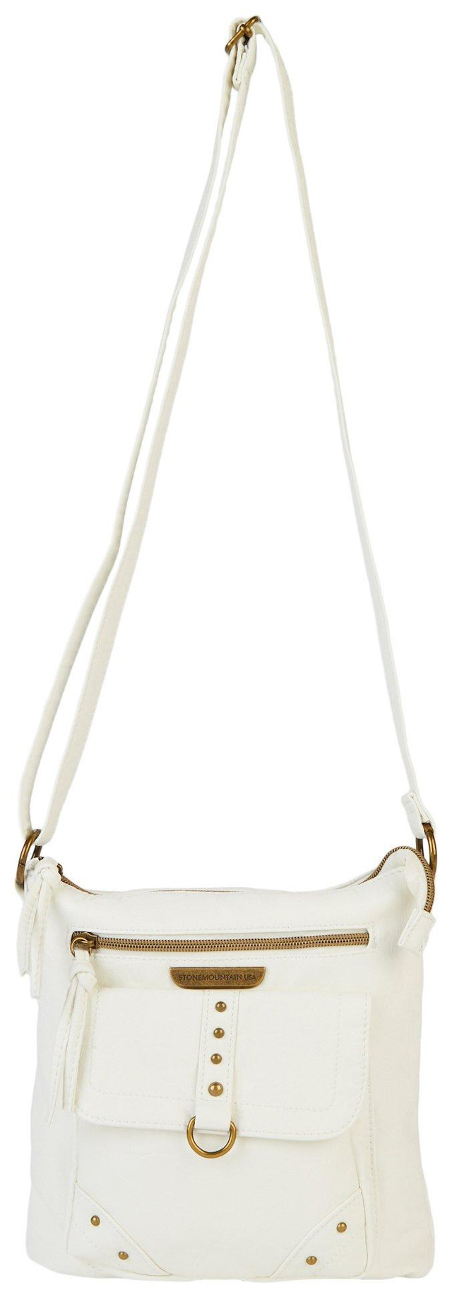 The Stone Mountain Smokey Flap Crossbody Bag is the perfect get up and go style. It features super soft material, conveniently placed exterior pockets, back pocket, interior zipper closure, interior slip pockets, elephant studs at the side and an adjustable crossbody strap drops 28. Modern bronze-toned hardware. This handbag offers functionality and comfort making it a must have. Measures approximately 4 in. D x 10 in. H x 10 in. W. Strap drop approximately 28 in.