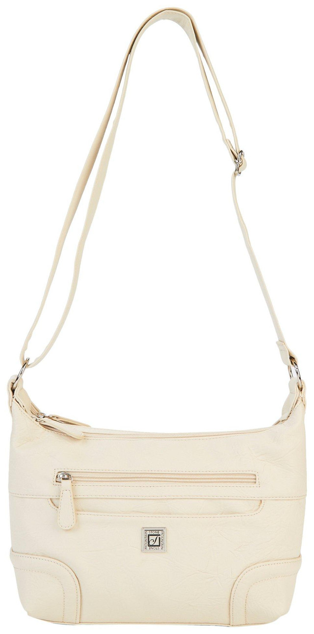 Stone Mountain Sophia Hobo Bag features 9 pockets for smart organization. Made with washed bonded leather and manmade trim, it includes 1 zip top entry, 2 front and rear zip and slash pockets, interior zip and slip pockets, silvertone hardware, and a signature liner. The adjustable shoulder strap adds comfort. A stylish everyday handbag for work, errands, or travel.