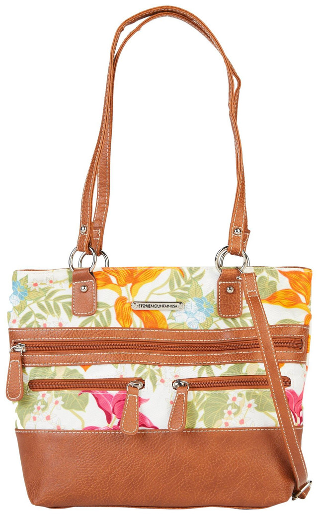 Have all the space you need with this Stone Mountain tropical garden canvas shoulder bag. Providing top zip closure, double satchel handles, an adjustable crossbody strap, exterior zip pockets for added space, interior slip pockets, and a bold and bright floral design throughout. Measures: 9 on. H x 13 in. W x 3 in. D. Handle Drop: 26 in.