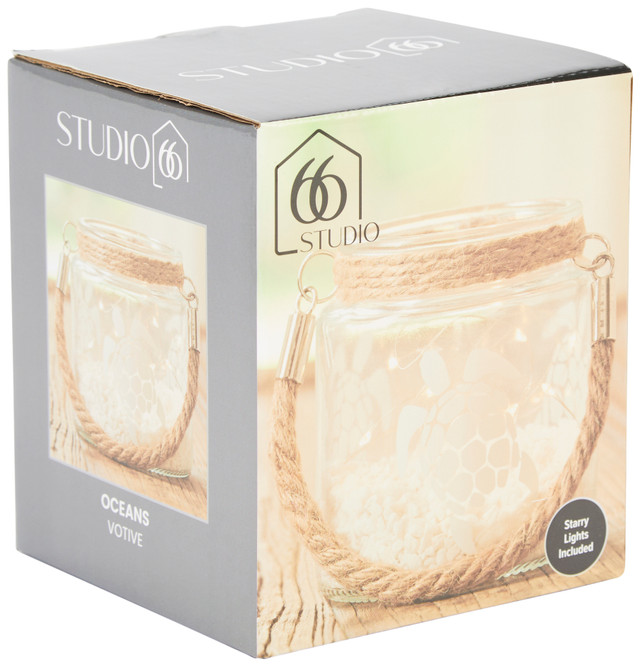 Perfect for any room in your home, this coastal inspired votive includes starry lights and white gravel to create a one of a kind lighting piece. The thick rope handle adds a rustic, nautical touch while making it easy to carry or hang. Whether used as an accent on a shelf, a glowing centerpiece, or ambient lighting on a patio, this votive delivers a relaxing, seaside vibe year-round. Measures 3.94 in x 3.94 in