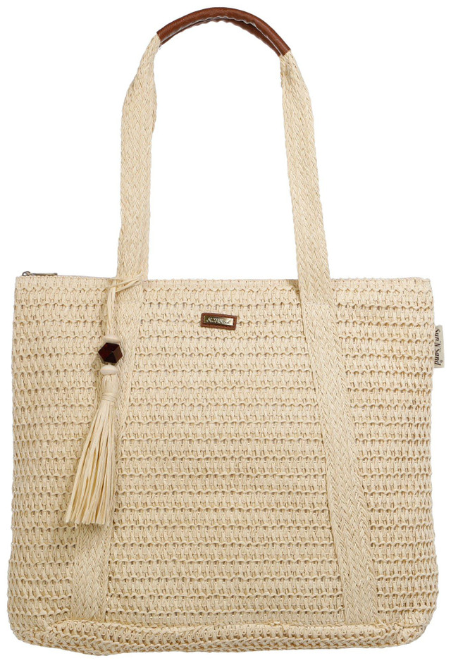 Breeze through summer with this chic straw beach tote, designed for both style and function. Featuring comfy shoulder straps, a secure zippered top, and a spacious interior, it keeps your essentials organized with a zippered pocket and two open pockets. Whether you're seaside or city-bound, this tote is your perfect sunny-day companion. Measures approximately 17 in x 16 in x 5 in.