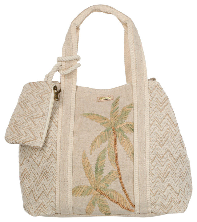 This soft beach bag features embroidered palm trees with a magnetic closure and lined interior with pockets. An attached zippered pouch adds convenience, making it both stylish and practical for sunny days by the water. Measures approximately 16 in x 12.5 in x 7.5 in.
