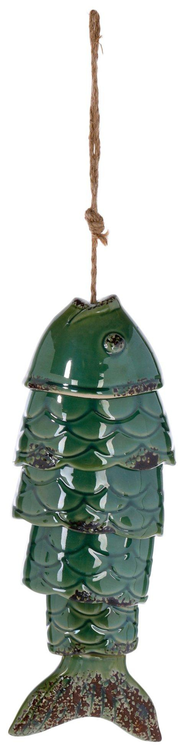 Bring coastal charm to your outdoor space with the 21 in Ceramic Hanging Fish Wind Chime. Crafted from ceramic, it features a fish shaped design that create soothing sounds in the breeze. Ideal for patios, gardens, or porches. Measures approximately 21 in x 4.5 in x 4.5 in.