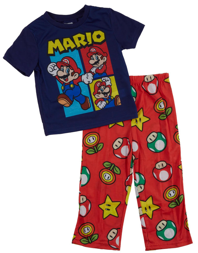 The Super Mario Brothers Little Boys 2-Piece Pajama Pants Set includes a comfy top and matching pants, both featuring colorful Super Mario graphics. Perfect for playful nights and gaming-inspired dreams.