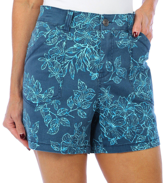 These Alix shorts feature a stylish vintage leaf design on lightweight stretch fabric, two front pockets, two back button-flap pockets, and fashionable seam detailing. The inseam measures approximately 5 in. Fabrication is 96% cotton and 4% spandex.