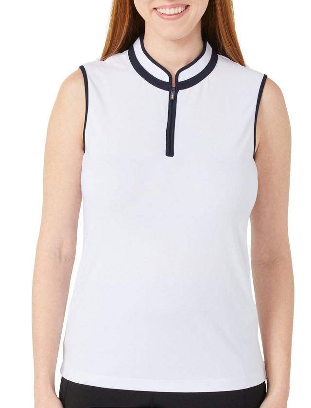 The Womens Active Zip Polo Tank Top combines sporty style with comfort. Featuring a solid color accented by piping, it includes a quarter zip polo neckline for a sleek look. The performance stretch fabric ensures ease of movement, making it ideal for active days or casual wear. Fabrication 48% nylon, 47% cotton, 5% spandex.