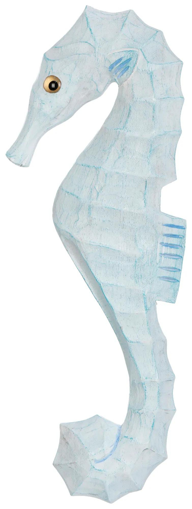 Bring coastal elegance to your walls with the Carved Wood Left Facing Seahorse Wall Decor featuring artisan craftsmanship in light aqua blue green tones with gold eyes and a curled tail. Ideal for adding serene ocean inspired charm to any room. Fabrication is wood. Measures approximately 14.5 in x 5.5 in x 1.25 in.