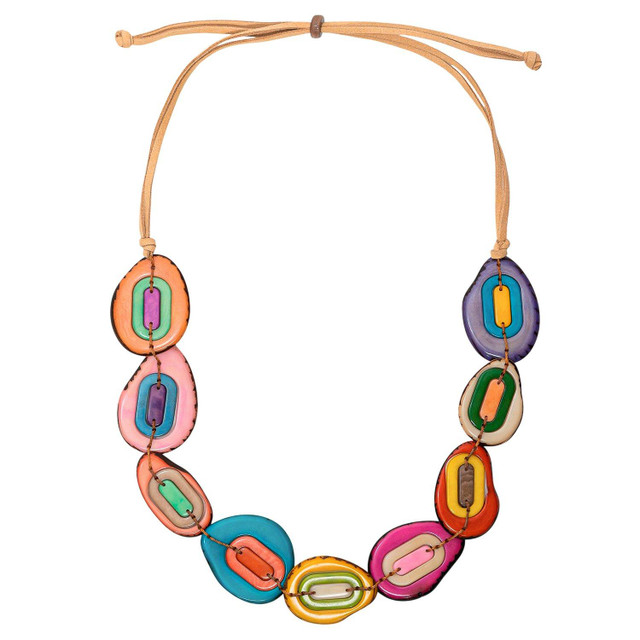 Add a pop of vibrant color with this sustainable statement necklace crafted from natural tagua nuts. Featuring bold, multicolored geometric pieces strung on an adjustable cord, this lightweight accessory blends eco-conscious style with artistic flair. Perfect for those who love unique, handcrafted jewelry thats kind to the planet.