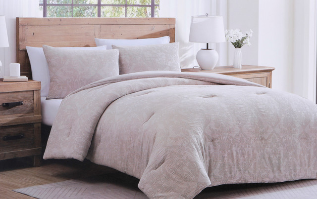 Transform your bedroom with the 3 Pc Camille Comforter Set, featuring an embroidered design on the comforter and two matching pillow shams. Designed for comfort and style, this set adds a cozy, coordinated look to your space, making it the perfect upgrade for restful nights and elegant decor. Fabrication 100% cotton