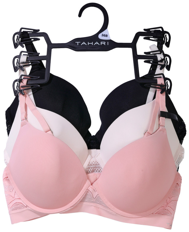 Upgrade your daily essentials with the Tahari 3-Pack of Everyday Fit Bras. Each bra features elegant lace wraps and adjustable straps for a custom fit. Designed with underwire support and underarm smoothing panels, they offer a sleek silhouette under any outfit. Made from a soft blend of 85% nylon and 15% spandex, these bras are ideal for all-day comfort and style.