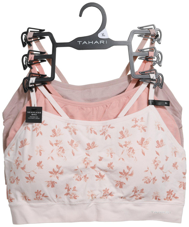 Enhance your wardrobe with this 3-Pack of Seamless Cross Back Bras. Featuring adjustable straps and removable pads, these bras provide a customizable fit and support for any activity. The cross back design adds a stylish touch while ensuring maximum comfort and stability. With seamless construction, these bras offer a smooth, invisible look under any outfit. Fabrication is 95% nylon, 5% spandex.