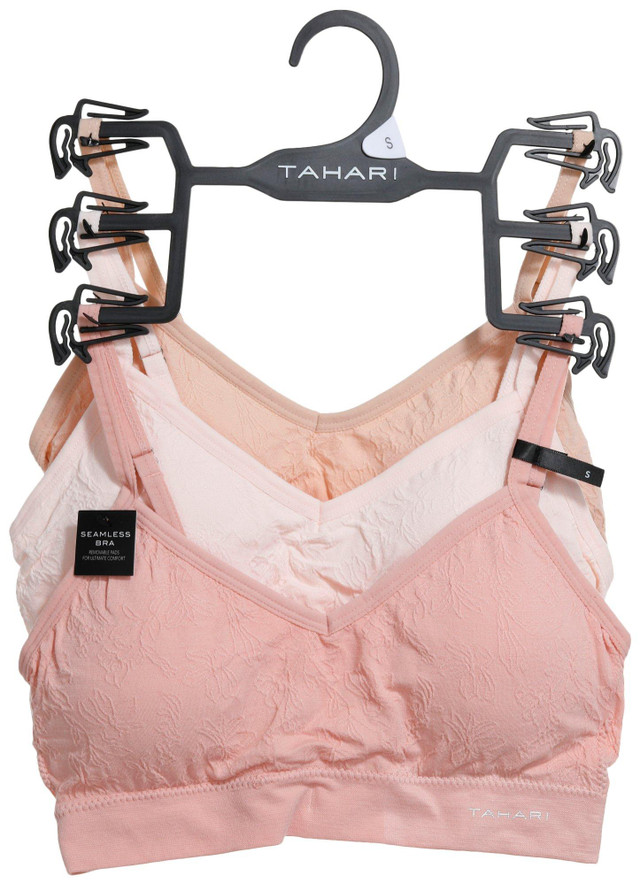 Experience the ultimate in comfort and versatility with this 3-Pack of Seamless Jacquard Bras. Each bra is designed with adjustable straps and removable pads, allowing you to customize your fit and support. The seamless jacquard fabric offers a smooth, stylish look under any outfit, while ensuring all-day comfort. Perfect for any occasion, this 3-pack provides the ideal blend of functionality and elegance. Fabrication is 53% polyamide, 45% rayon, 2% elastane.
