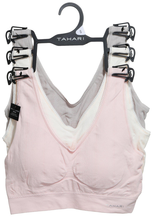Indulge in ultimate comfort with this 3-Pack of Seamless Bras. Crafted from ribbed fabric, these bras offer a unique texture and a snug fit. The delicate lace trim adds a touch of elegance, while the removable pads allow for customizable support. Perfect for any occasion, these bras provide a seamless look under clothing, ensuring you feel confident and comfortable all day long. Fabrication is 96% nylon, 4% spandex.