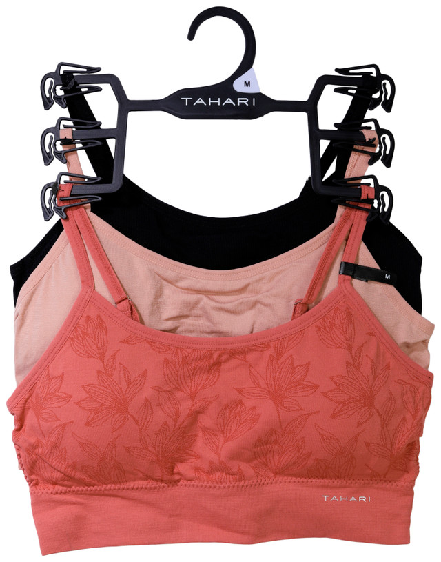 The Tahari 3-Pack Seamless Comfort Bra offers wire-free support with a smooth, invisible fit under any outfit. Made from 96% nylon and 4% spandex, each bra features adjustable straps and removable cups for personalized comfort. Ideal for everyday wear, this set combines style, flexibility, and all-day ease