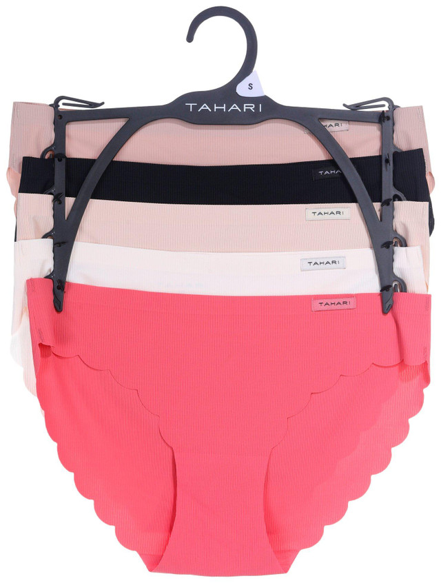 Elevate your everyday essentials with our Women's 5-Pack Lazer Scallop Bikini Panties. Made from a soft and stretchy blend of nylon and spandex, these panties offer a comfortable fit that moves with you. Featuring a stylish solid ribbed design, they provide a seamless look under any outfit. Perfect for daily wear, these bikini panties are a chic and practical addition to your lingerie drawer.