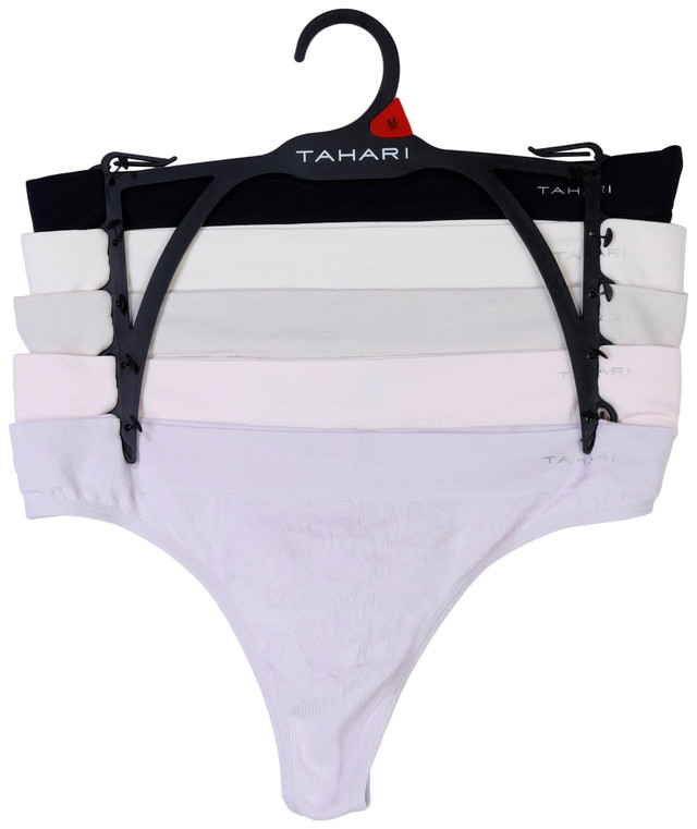 The Tahari Womens 5 Pack Seamless Thong Panties offer soft stretchy fabric and a smooth fit with no lines under clothing. Designed for all day comfort these thongs feature a seamless construction and stylish colors to elevate your everyday essentials.