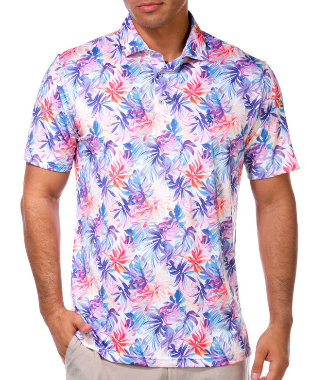 Introducing the Watercolor Leaves Short Sleeve Performance Polo, perfect for your next getaway. Featuring a vibrant tropical print, this polo offers sun protection, cooling, and moisture-wicking properties to keep you comfortable in any climate. Fabrication is 96% polyester, 4% spandex.