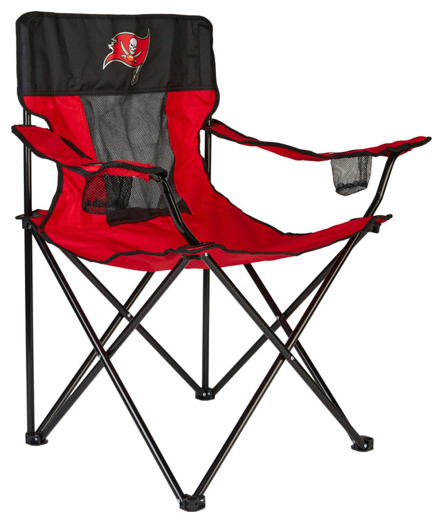Relax in team spirit with the Tampa Bay Buccaneers Elite Chair. Built for comfort and durability, this chair measures 22.5 in x 34.5 in x 34 in frame with a seating area of 18 in x 23 in. It supports up to 275 lbs, making it perfect for tailgates, camping, or watching the game. Includes armrests, a built-in cup holder, and a carry bag with team graphics. Folds easily for storage and transport. A must-have for any Bucs fan!