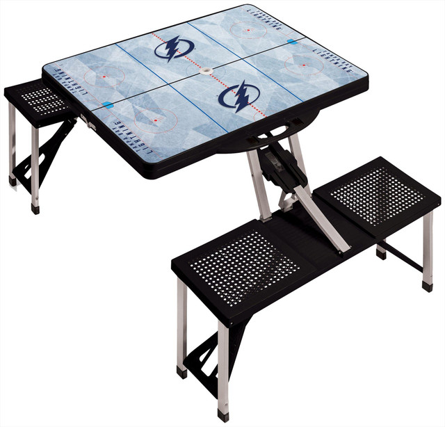 This picnic table is a compact fold-out table with legs and seats that fold into the table when collapsed. Maximum weight capacity of 250 lbs. per seat and 20 lbs. for the table. Compatible with standard sized beach umbrellas. Open: 54'' x 34'' x 25.8'' Folded: 33.5'' x 4'' x 13.''