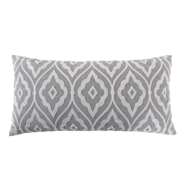 The Embroidered Trellis decorative pillow matches perfectly with the Levtex Home Tamsin Grey bedding collection. This pillow is sized at 12x24in. and features an intricate trellis pattern. The grey and off white color palette makes this a versatile accessory for your bed, couch or favorite chair. The pillows comes pre-filled with a soft luxurious feather inner.