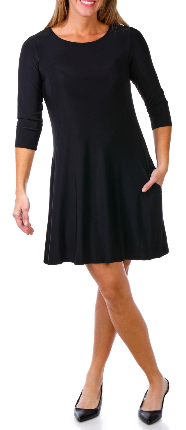Stay effortlessly polished in this Womens 3/4 Sleeve Stretch Swing Short Dress, featuring 3/4 sleeves, a solid color design, a flattering round neckline, and a short swing skirt with convenient side seam pockets. The soft, stretchy fabric delivers refined comfort and easy movement, making it perfect to dress up or down for work, weekends, or a night out. A perfect little black dress for any wardrobe. Fabrication is 95% polyester, 5% elastane.