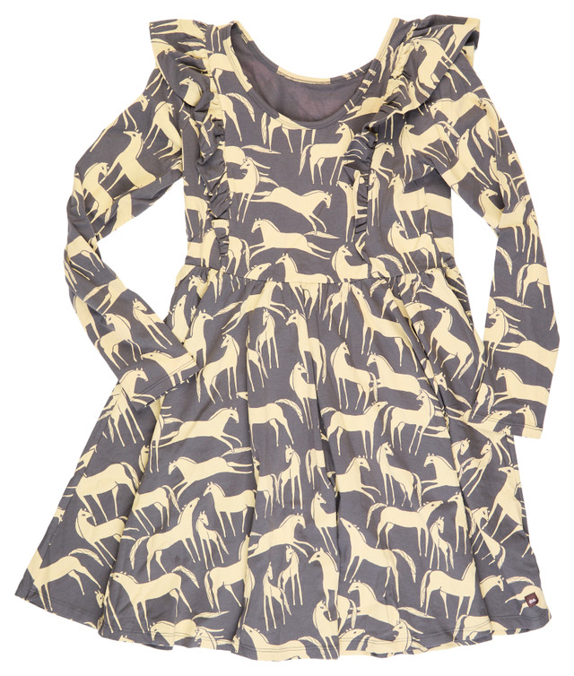 Twirl through the day in the Big Girls Long Sleeve Ruffle Ballet Dress, designed for comfort and charming style. A scoop neckline bodice with long sleeves and ruffles from the shoulder pairs with a full skirt featuring a playful horse print for a polished look. Soft all cotton fabric keeps her comfortable for parties, pictures or everyday wear. Length measures approximately 32 in. Fabrication is 100% cotton.
