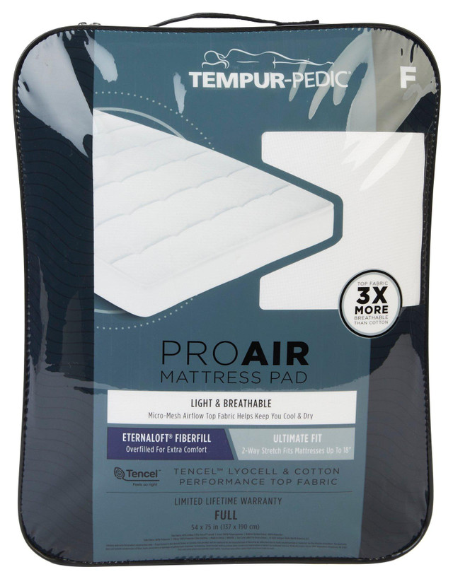 Experience enhanced comfort with the ProAir Cotton Tencel Blend Mattress Pad - Full, featuring a light and breathable design with micro mesh airflow top fabric to help keep you cool and dry. Overfilled for added softness and crafted with 2-way stretch for a secure fit. Measures approximately 54 in x 75 in and fits mattresses up to 18 in deep. Fabrication is 65% cotton 35% tencel lyocel (top), 100% polypropylene (liner), 100% polyester (botton).
