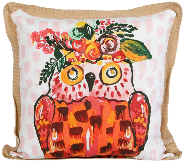 Brighten your space with this 18 inch square outdoor pillow, featuring a vibrant expressionist owl print and coordinating woven edging. Made for style and durability, it adds a playful touch to patios, porches or sunrooms while doubling as a cheerful focal point for any seating area. Fabrication is 100% polyester. Measures approximately 18 in x 18 in.