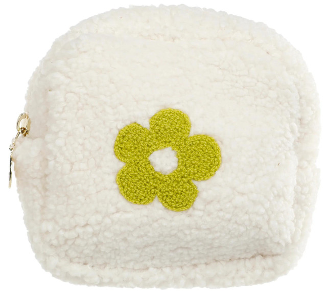 This Flower Square Teddy Pouch is the perfect way to add a touch of style and sweetness to your everyday routine. Made from soft sherpa material with flower details, it features a water-resistant lining inside and gold zipper details. Plus, it pairs perfectly with the rectangle pouch for added convenience and functionality.