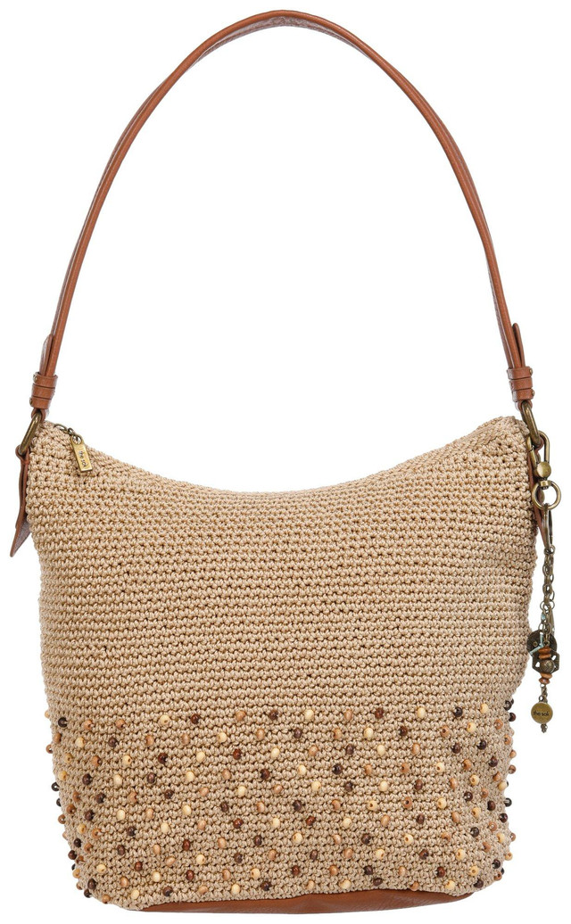 Discover casual elegance with this beaded hobo bag. It features a stylish woven design, antique brass tone hardware, one exterior zip pocket, top zip closure and signature charm keychain dangle. The lined interior includes one zip pocket and two slip pockets. Whether you're strolling the boardwalk or heading out for brunch, this bag adds a touch of natural flair to any outfit. Measures approximately 13 in x 13 in x 4 in.