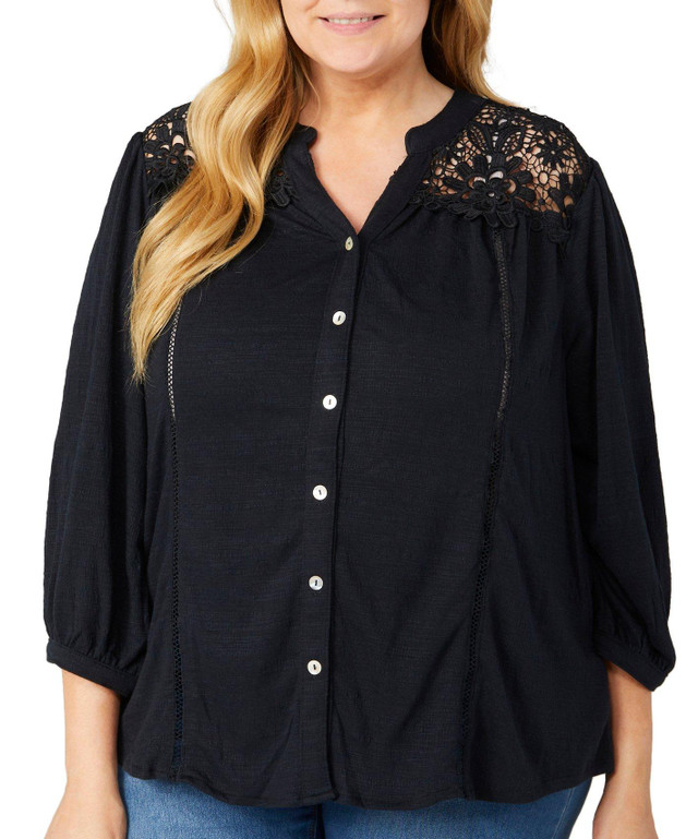 Introducing the Plus 3/4 Sleeve Lace Button Down Top, crafted from a blend of polyester, rayon, and spandex for a comfortable and stylish fit. This elegant top features a button-down front, a solid exterior, and beautiful floral lace detailing on the shoulders. With a length of 26 inches, it's perfect for any occasion, adding a touch of sophistication to your wardrobe.