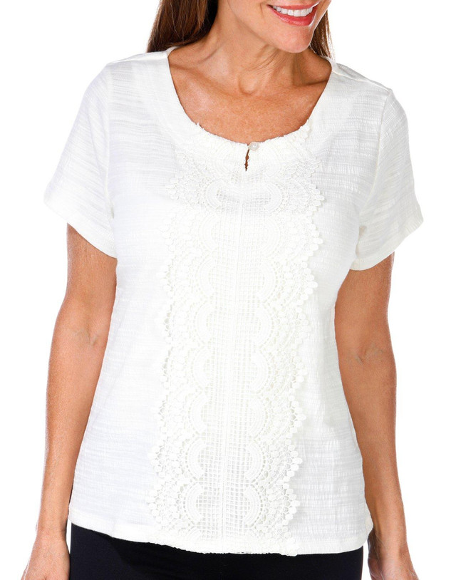 Add a delicate touch to your look with this Women's Short Sleeve Lace Neck Top. Featuring a solid color and short sleeves, its accented with a lace design on the chest for a soft, feminine finish. Ideal for both casual and dressy occasions. Fabrication 71% polyester, 28% rayon, 1% spandex