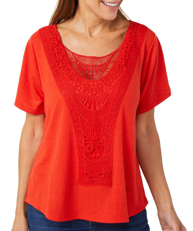 Add texture and charm with this womens short sleeve top featuring soft fluttery fabric and crochet decoration on the front. Lightweight and breathable it offers a relaxed fit perfect for warm days or layered looks. Designed for comfort and style this top brings effortless elegance to any outfit. Fabrication is 71% polyester, 28% rayon, and 1% spandex.