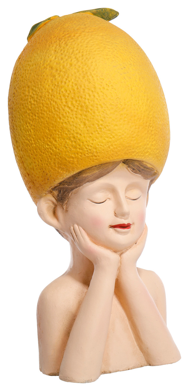 Add whimsical charm to garden spaces with the 16 in Lemon Girl Garden Figurine. Featuring a serene bust of a girl with closed eyes and a sculpted lemon crown, the design blends playful detail with artistic form. Crafted from durable cement. Measures approximately 16 in x 7 in x 8 in.