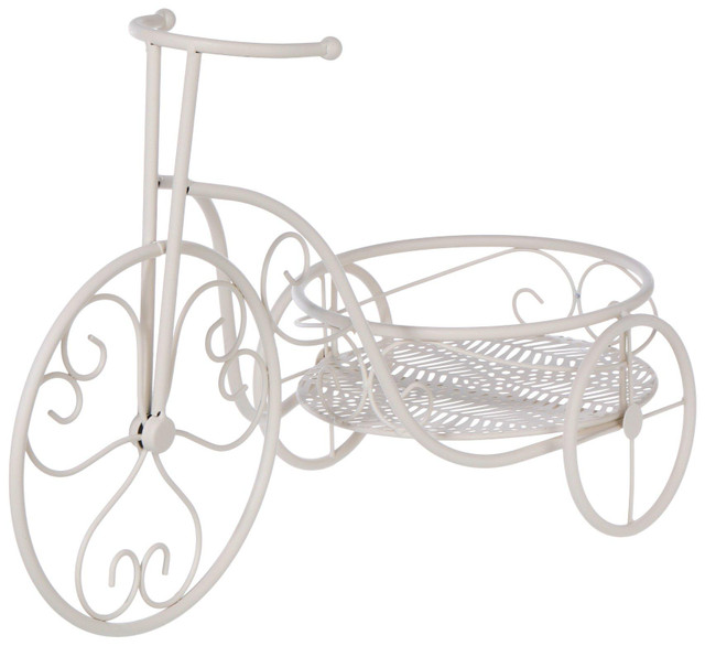 Bring a touch of whimsy to your garden or home with this charming tricycle plant stand. Measuring 21 in x 10 in x 14.5 in, it features a single metal basket perfect for showcasing your favorite potted plant or floral arrangement. The vintage inspired tricycle design adds decorative flair, while the sturdy metal frame ensures lasting durability. Ideal for patios, porches, or indoor spaces.