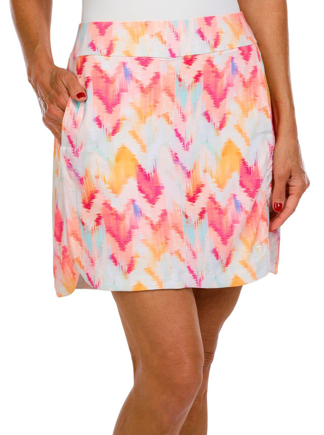 This women's active skort features a colorful print with a pull on waistband, moisture wicking fabric, UPF 50 plus protection, and an antimicrobial design. It blends vibrant style with performance for sunny days on the move. Fabrication 84% nylon, 16% spandex