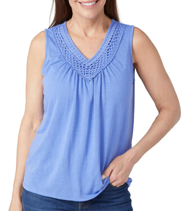 Add a touch of charm to your warm-weather wardrobe with this sleeveless top, featuring delicate crochet trim for a feminine finish. Lightweight and breezy, its perfect for layering or wearing on its own for effortless style. Fabrication is 56% Rayon 44% Polyester.