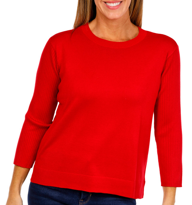 Add cozy style to your wardrobe with the Petite Long Ribbed Sleeve Solid Sweater. Featuring a classic crew neckline, long ribbed sleeves, and a solid color knit, this soft sweater pairs effortlessly with jeans, skirts, or layered looks for versatile everyday wear. Fabrication is 70% rayon 30% polyester. Length measures approximately 23 in.