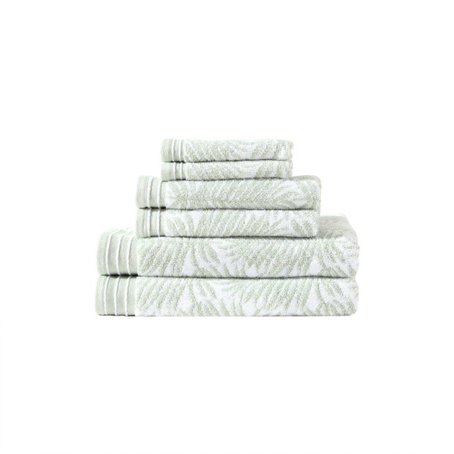 Update your bathroom décor with the Tommy Bahama Linear Palms 6-piece towel set, showcasing a green palm leaf design on a white background. Constructed with 100% cotton yarn-dyed terry loops, these towels are luxuriously soft and medium-weight. The set includes 2 bath towels, 2 hand towels, and 2 wash towels. Measurements: bath towel 28 in. x 54 in., hand towel 16 in. x 26 in., wash towel- 12 in. x 12 in. Machine washable for easy care.
