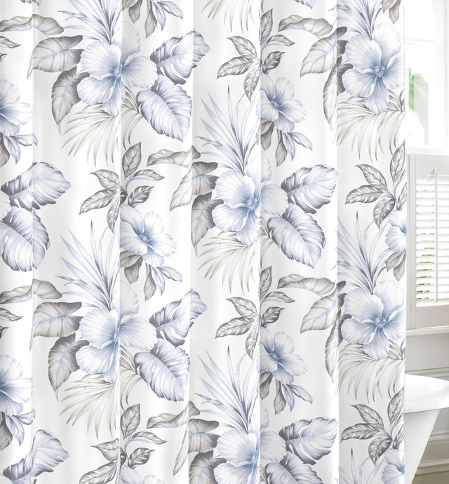 The Casablanca Garden Pastel Grey Shower Curtain from Tommy Bahama features a gorgeous floral print. The shower curtain is constructed with 100% cotton and 12 evenly spaced hole openings for hooks. Shower curtain measures: 72'' x 72''.