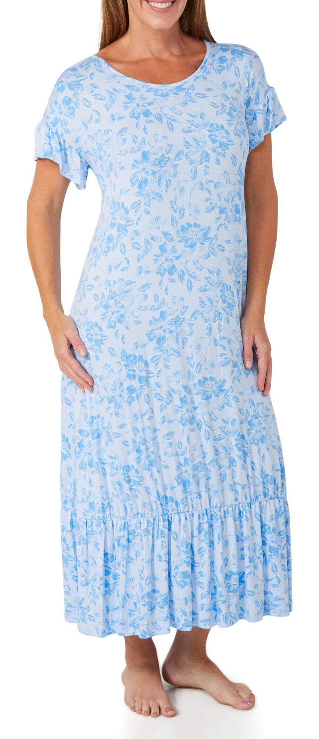Slip into serenity with this long short sleeve nightgown, adorned in a delicate floral print that whispers elegance. Crafted for comfort and grace, its flowing silhouette drapes softly, making every evening feel like a gentle retreat. Whether you're winding down or welcoming a slow morning, this nightgown brings timeless charm to your nightly ritual. Fabrication is 95% rayon, 5% spandex.