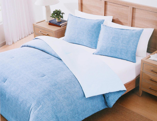 This king comforter set is made from all cotton and includes one comforter and two shams. Featuring a textured blue color and easy care fabric, it provides soft, breathable comfort and adds a stylish, cozy touch to any bedroom.
