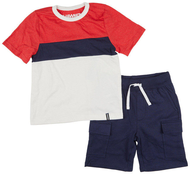 This 2-piece RWB Knit Shorts Set for little boys features a bold red, white, and navy color block t-shirt paired with comfy pull-on cargo shorts. Made from a soft, breathable 60% cotton and 40% polyester blend, it is perfect for active summer days with a patriotic twist.