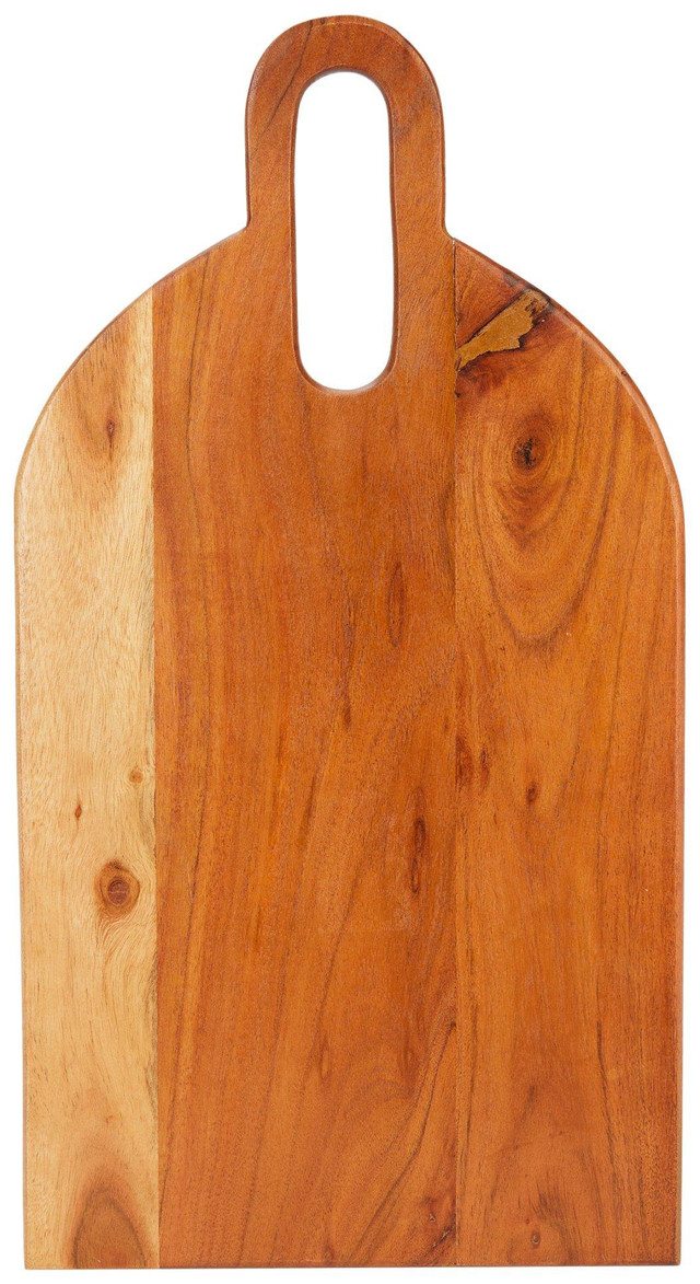 This solid wooden serving board features a built-in handle for easy carrying and serving, adding a rustic and stylish touch to any table or gathering. Measures approximately 20 in x 10.5 in, including handle.