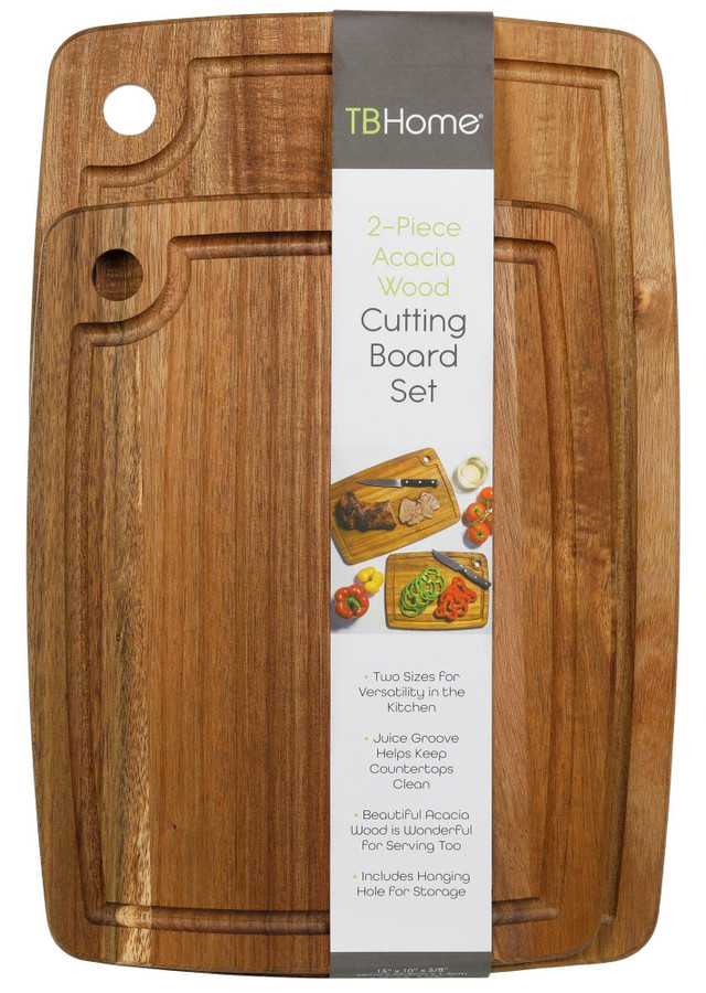 This 2 piece cutting board set from Totally Bamboo is crafted from rich acacia wood for lasting durability and natural beauty. Each board features deep juice grooves to catch liquids and a hanging hole for easy storage. The large board measures 15 by 10 inches and the small one is 12 by 9 inches, both with a sturdy 5/8 inch thickness. Ideal for slicing, chopping, and serving in style.