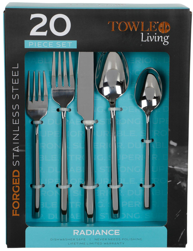 The 20 piece Radiance Forged Flatware set features a sleek handle design, making this set the perfect understated complement to your favorite dinnerware and stemware. Quality crafted of 18/0 stainless steel and perfect for everyday use, this set includes (4) each: dinner fork, salad fork, dinner knife, dinner spoon and teaspoon. Dishwasher safe for simple, thorough cleaning, and never needs polishing.