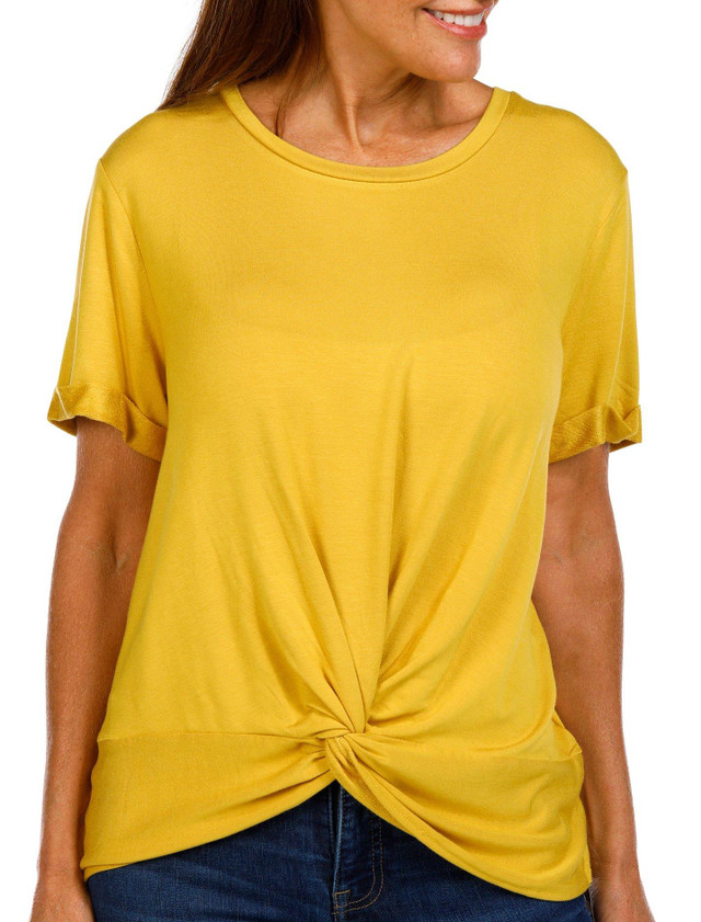 Effortless style comes through in a womens short sleeve top featuring cuffed sleeves and a front tie hem for a flattering finish. Crafted from a soft rayon-spandex blend, it offers breathable comfort perfect for casual days or easy layering. Top length measures approximately 25 in. Fabrication is 95% rayon, 5% spandex.