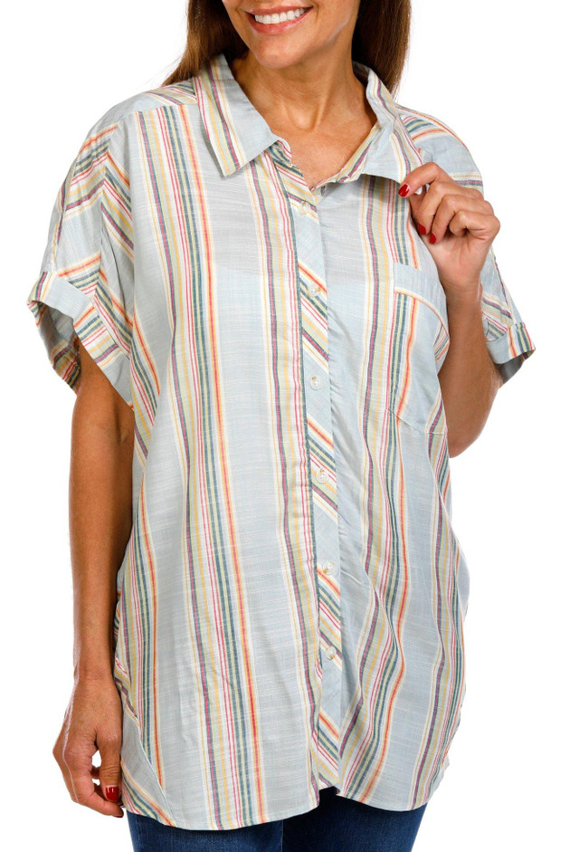 Classic stripes and a button-down front bring timeless charm to this womens short sleeve top. Designed with cuffed sleeves and a front chest pocket, its crafted from soft viscose for a lightweight, easygoing fit. Easy to layer over a tank or under a jacket, its perfect for office wear, casual outings, or weekend getaways. Top length measures approximately 31 in. Fabrication is 100% viscose.